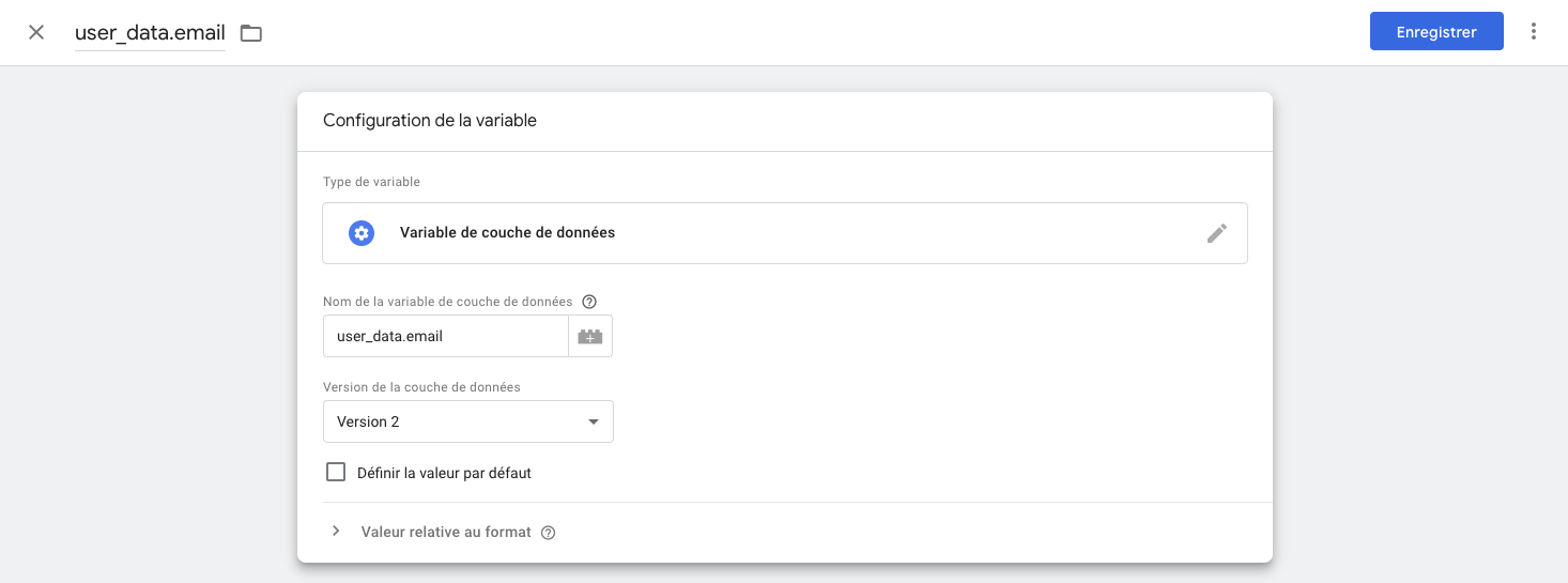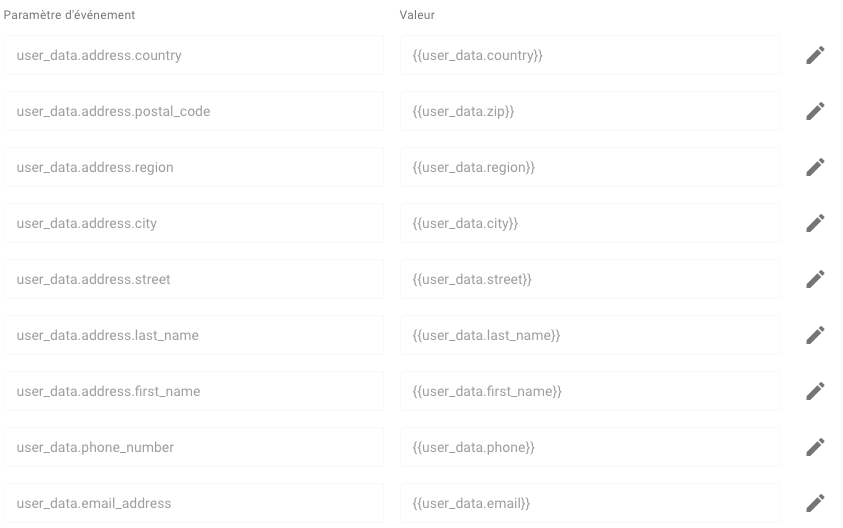Astuce : Pour éviter d’avoir à ajouter toutes les variables une par une dans chaque balise (vous verrez dans les prochaines étapes lors de l’implémentation des balises), nous allons créer une variable Balise Google : paramètres d’événement > et ajouter toutes les variables consommateur dans cette balise Google. Cela permettra d’aller chercher uniquement la balise User Data lors de la création de vos balises. Vous savez maintenant comment ajouter une variable alors vous pouvez juste utiliser la variable User data :