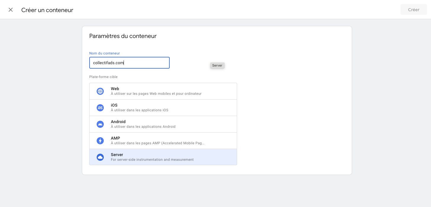 Entrez le nom de votre conteneur server. Vous pouvez mettre “Votre marque - Server” et sélectionnez “Server” comme plateforme cible. Puis cliquez sur Créer en haut à gauche.