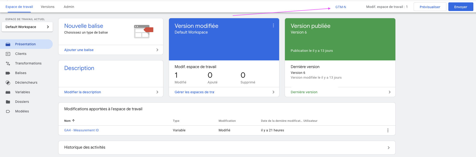 Il vous faudra aller sur votre conteneur server de GTM et cliquer l’id GTM que vous trouverez ici :