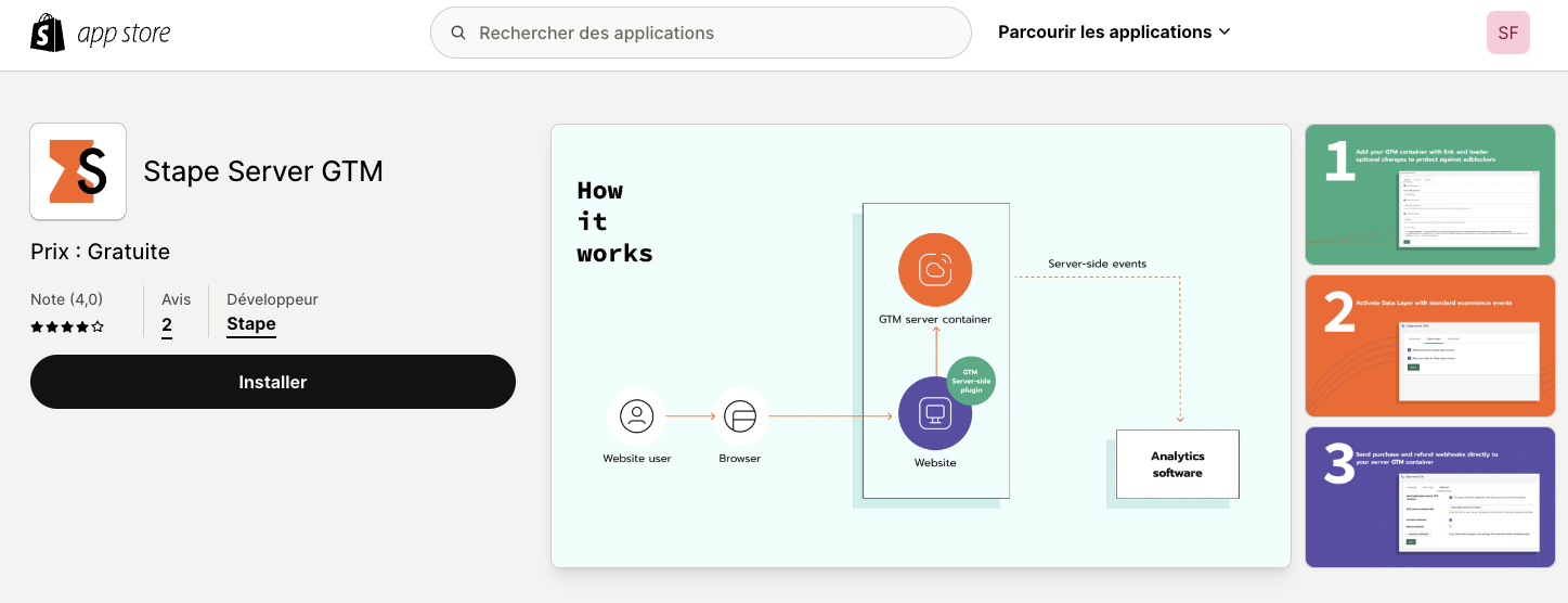 Pour installer ce dataLayer sur votre site Shopify je vous conseille d’utiliser l’application Stape.
