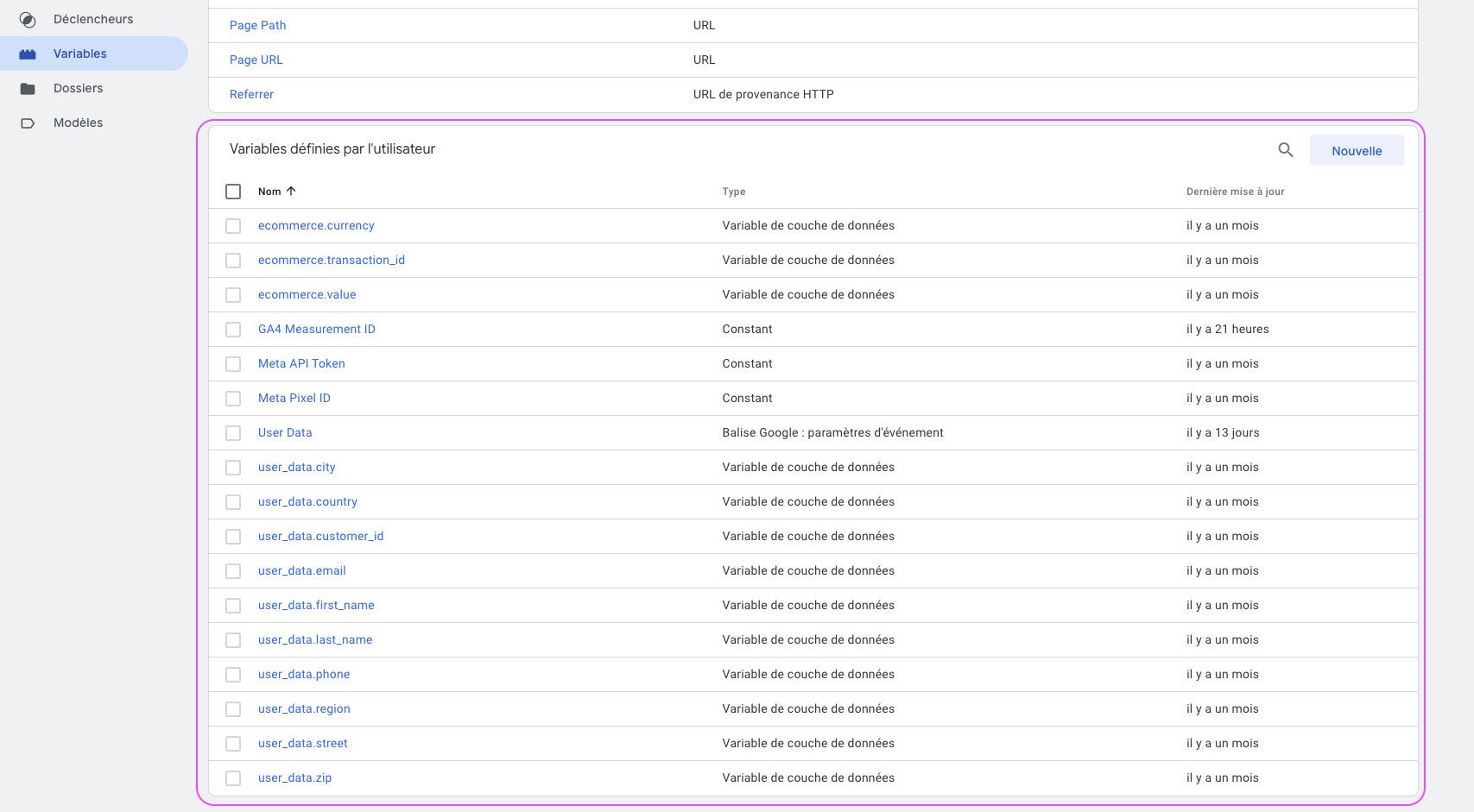 Rendez-vous dans votre conteneur client GTM dans l’onglet variable. Nous allons paramétrer toutes les variables e-commerce, et consommateur. Le but est d’avoir toutes ses variables :