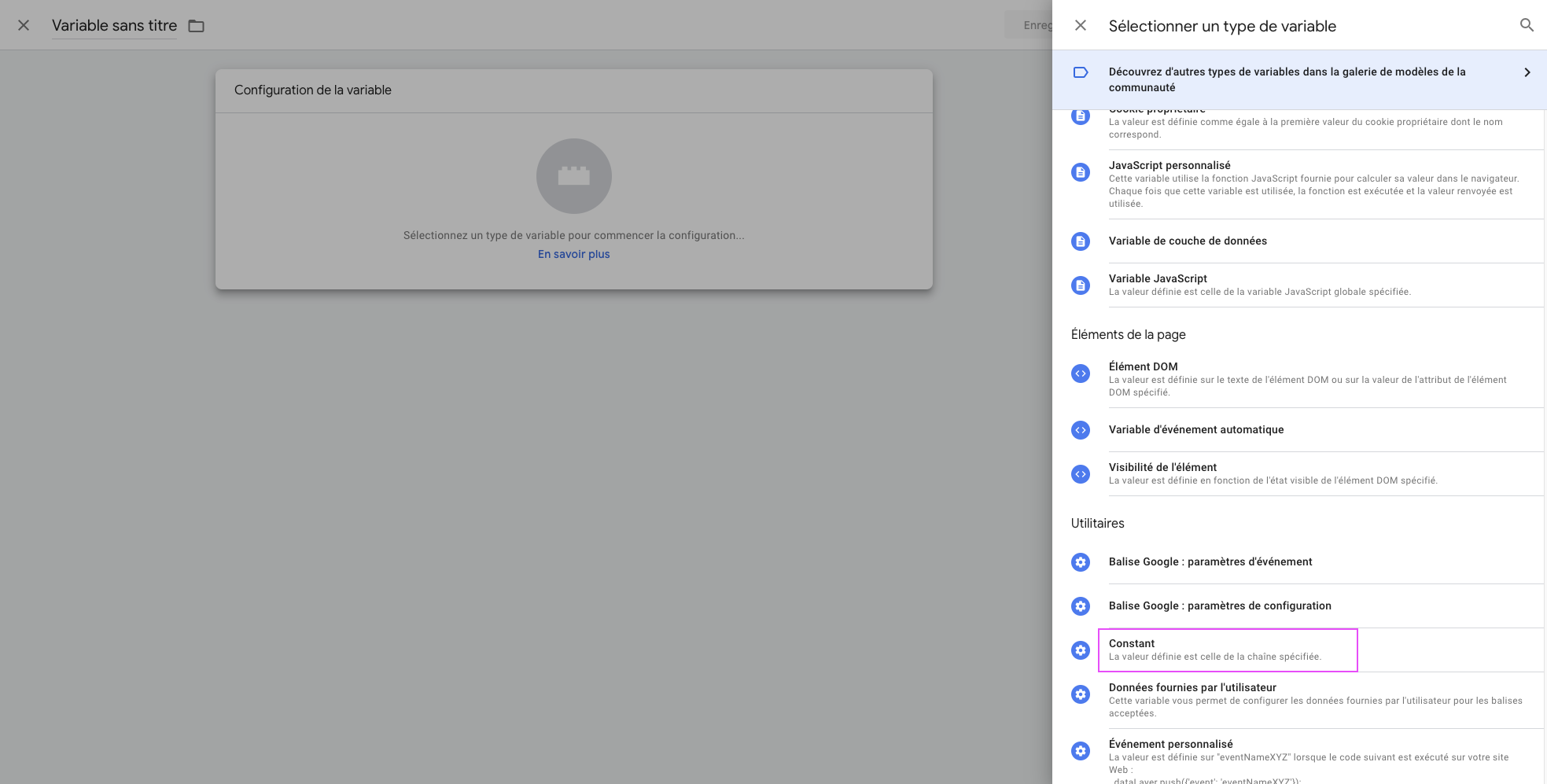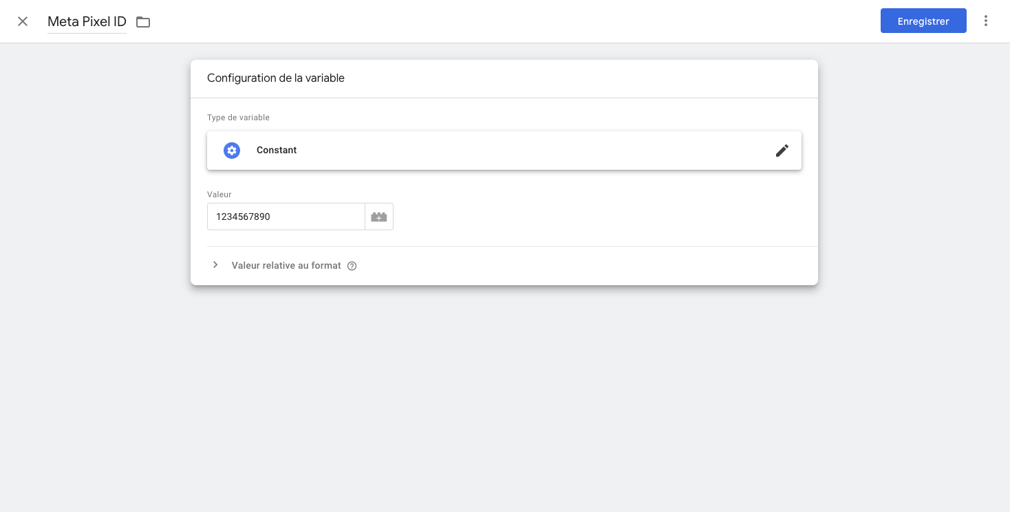 Une fois que toutes les variables de couches de données ont été mises, nous allons ajouter les constantes. C’est à dire l’id de GA4, l’id du pixel facebook, et le token de l’API de conversion meta. Ces constantes seront réutilisés plusieurs fois ce qui évitera de répéter les copier/coller. Et comme son nom l’indique ce sont des éléments qui sont toujours les mêmes.