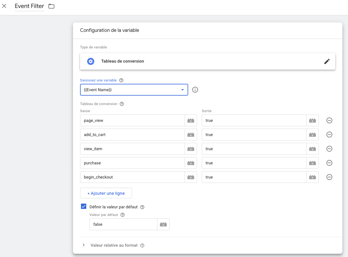 Cliquez sur Nouvelle dans “Variables définies par l’utilisateur” et ajoutez le type de variable “Tableau de conversion”. Allez chercher la variable Event Name. Ajoutez ensuite les saisies comme si dessous :