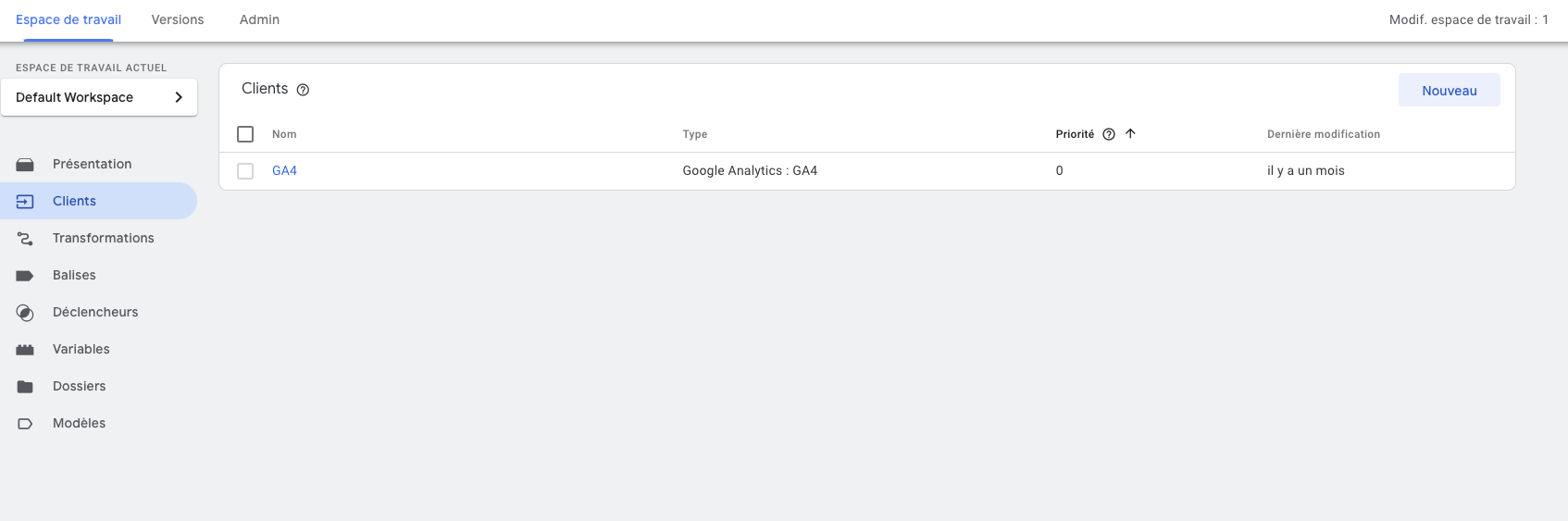 Dans l’onglet client, cliquez sur Nouvelle puis ajouter le type de client Google Analytics : GA4, appelez-le “GA4”.