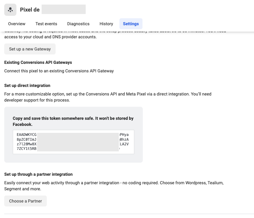 Faite de même pour le token de l’API de conversion Meta. Pour trouver votre token d’API de conversion il faut vous rendre dans votre business manager Meta, dans gestionnaire d’événements, puis sur votre pixel dans l’onglet setting. Descendez jusqu’à trouver “générer un token” cliquez dessus puis copier ce token pour le mettre dans la constante.