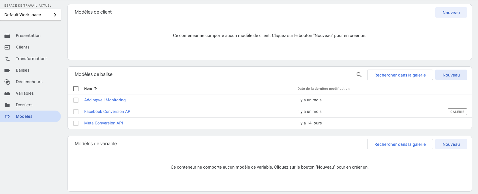 Commençons par la première : Addingwell Monitoring. Pour se faire il va falloir vous rendre dans l’onglet Modèle tout en bas à gauche pour ajouter ce modèle de balise. Puis cliquer sur Rechercher dans la galerie.