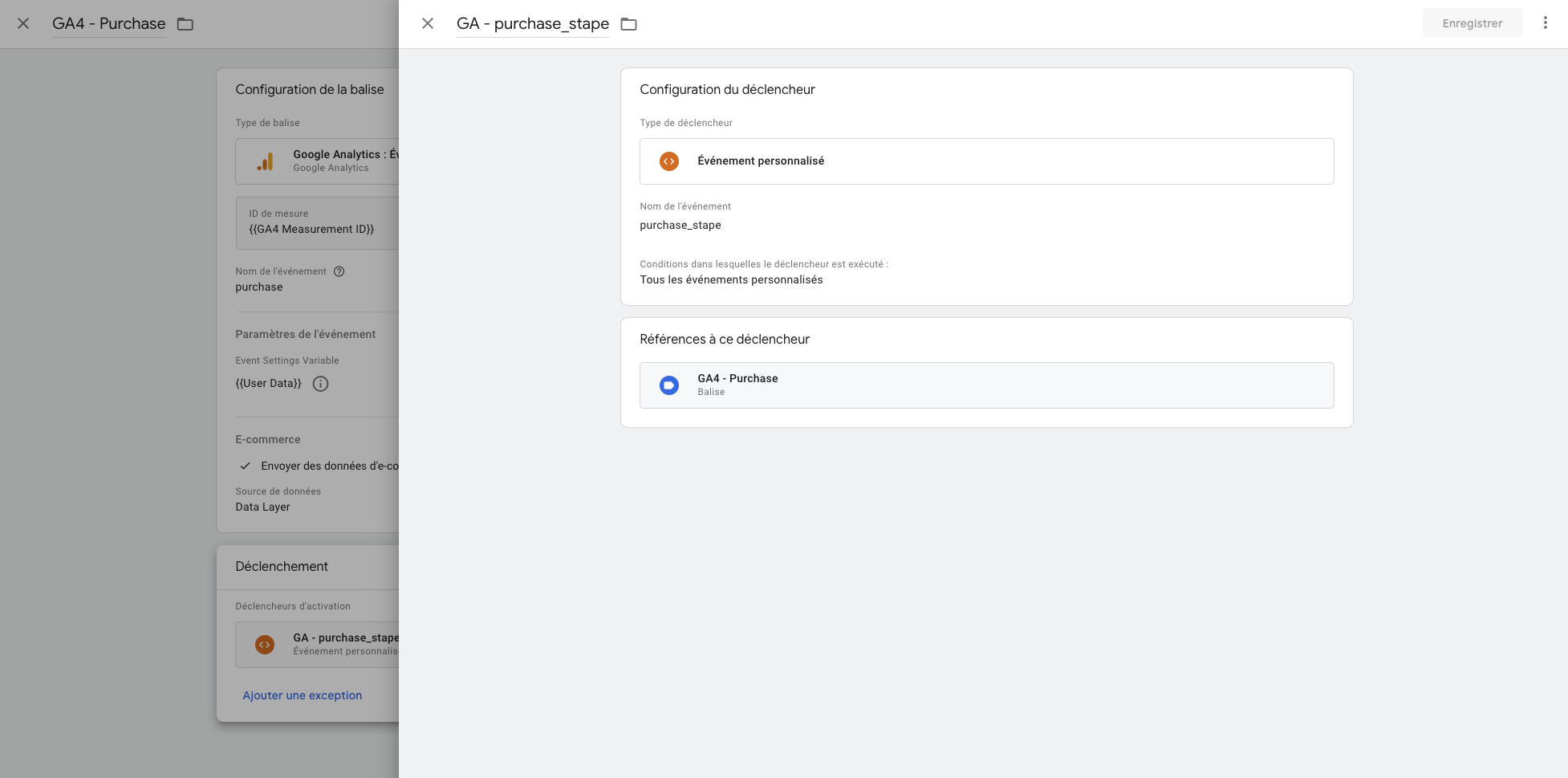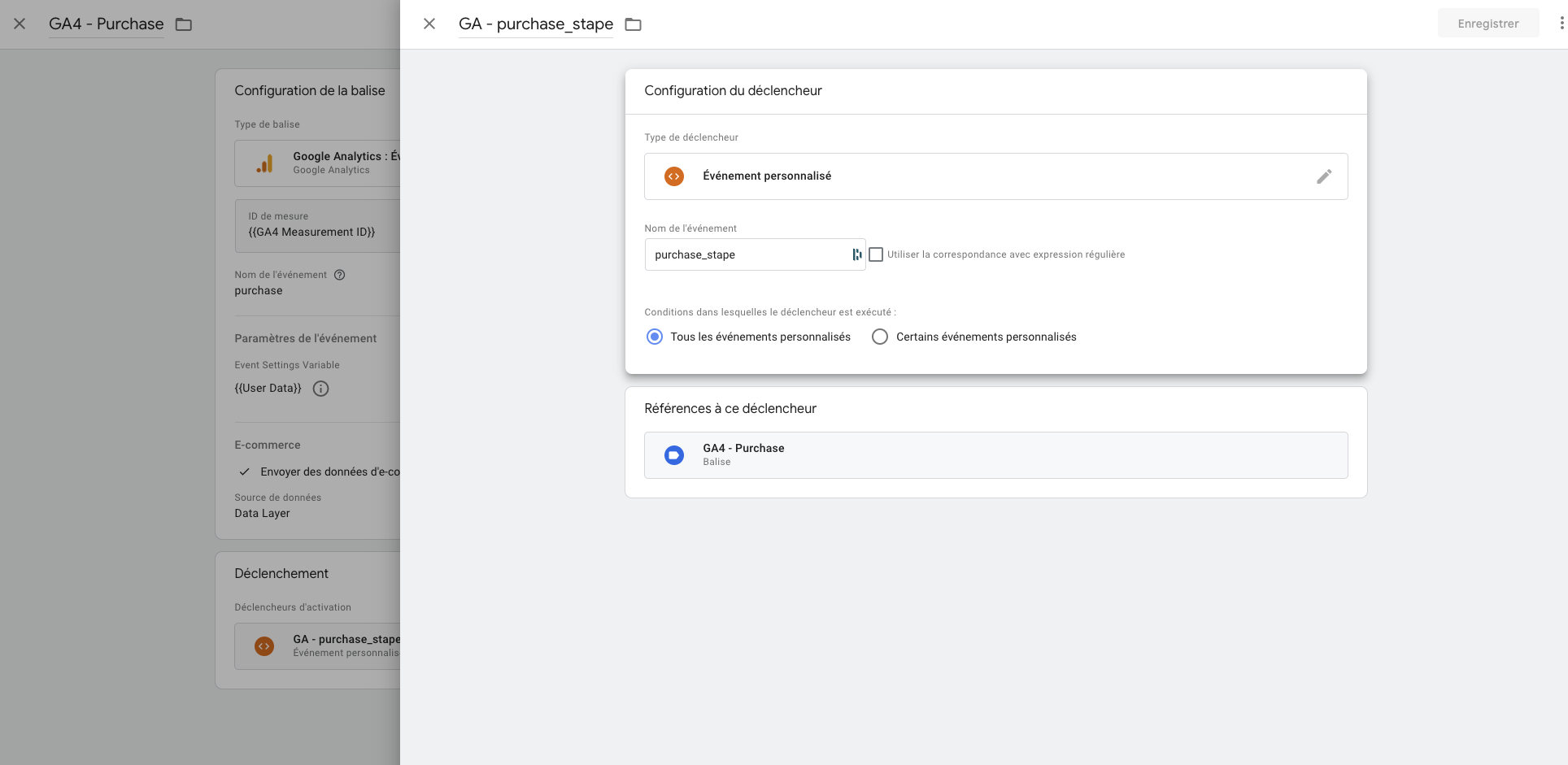 Prenons l’exemple de la balise GA4 - Purchase. Cliquez sur la balise GA4 - Purchase puis dans Déclenchement. Vous devrez ajouter un événement personnalisé où le nom de l’événement sera purchase_stape il est très important de respecter la casse, car le nom de l’événement correspond au nom que l’on retrouve dans le DataLayer placé dans Shopify.