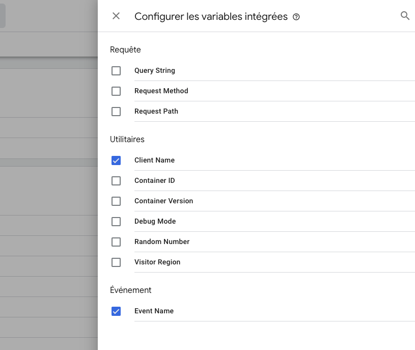 Il faudra commencer par ajouter les 2 variables intégrées en cliquant sur configurer puis en cochant Client Name et Event Name.