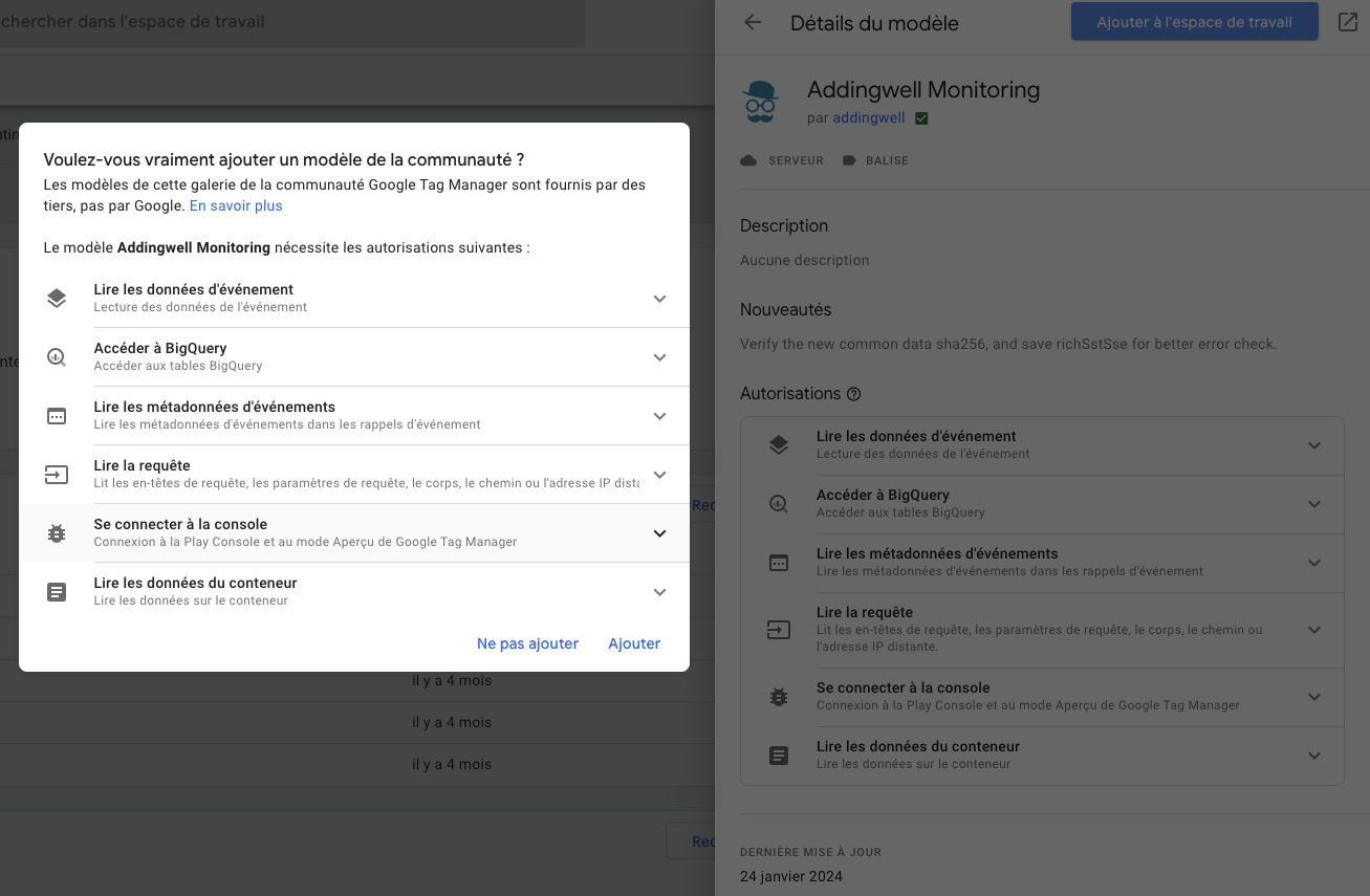 Recherchez Addingwell et sélectionnez le modèle Addingwell monitoring, ajoutez à l’espace de travail >ajoutez :
