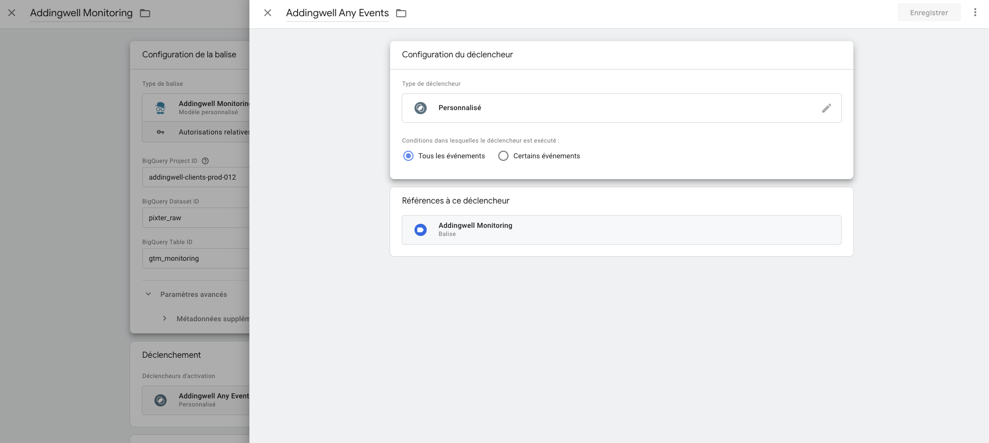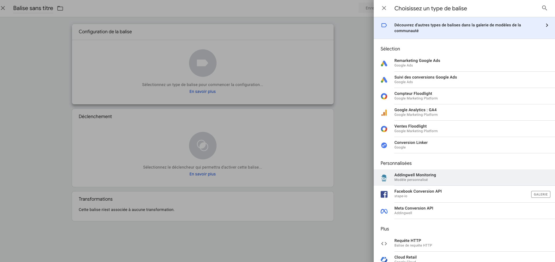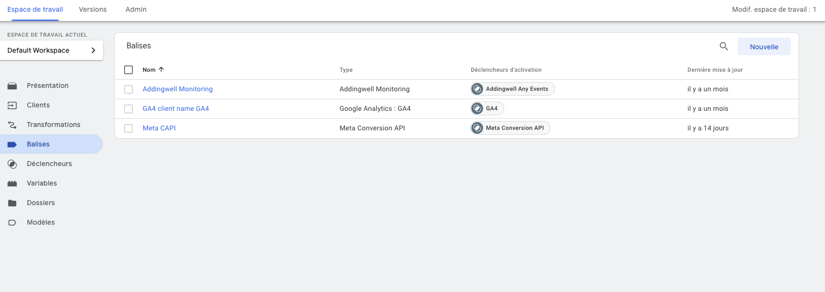 Retournez dans l’onglet balise, faites Nouvelle puis modifiez la configuration de la balise, et ajoutez Addingwell Monitoring :