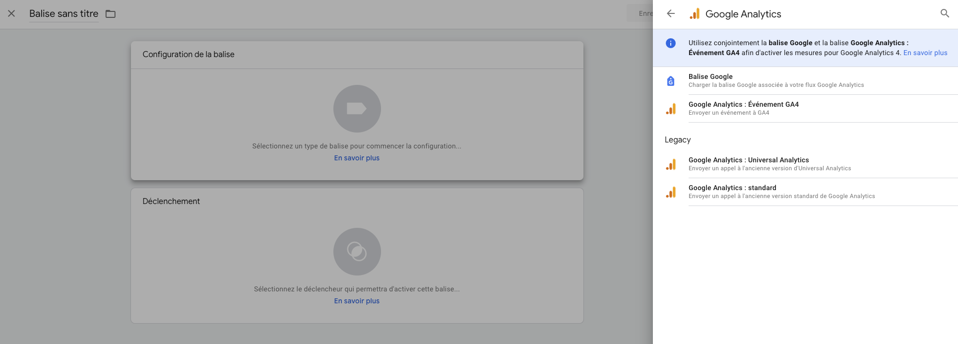 De la même manière que les balises, nous allons ajouter une nouvelle balise côté client, cette fois-ci nous allons prendre la Balise Google comme type de balise. On ajoute le measurement ID de GA4 dans l’id de la balise.