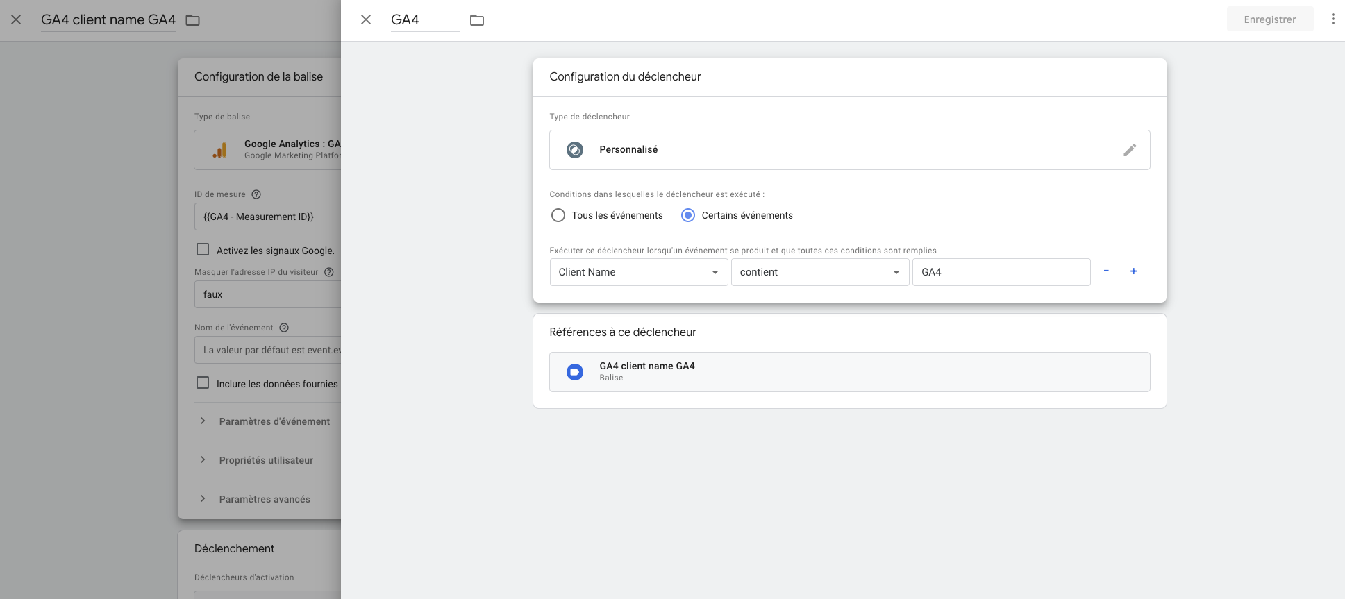 Pour cela ajouter un déclencheur personnalisé > certains événements > client Name Contient GA4.