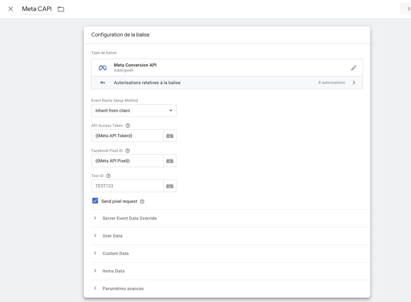 Enfin nous allons installer la balise Meta Conversion API en ajoutant une nouvelle balise, puis en sélectionnant Meta Conversion API (si vous ne la trouvez pas, il faut aller dans modèle, ajouter un modèle puis sélectionner Meta Conversion API). Insérez ensuite les variables Meta API token, Meta API Pixel et cochez “Send pixel request”.